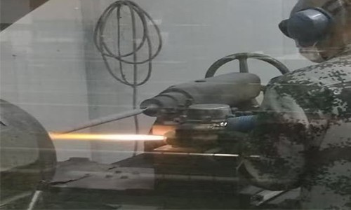 另一种方法是通过高压喷射燃料和氧气,使其在喷嘴外部燃烧,然后注入热喷涂粉末,并用高压气体将其从喷嘴轴向喷入火焰中,最后通过喷嘴外部空气罩中的压缩气体压缩燃烧火焰,加速熔化热喷涂粉末并将其喷向基材。